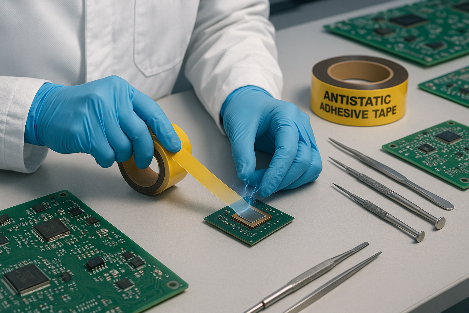Samling af printkort (PCB) og håndtering af halvlederkomponenter er blandt de højest prioriterede anvendelsesmuligheder for antistatiske tape. I pick-and-place-operationer kan tapefødere og bæretape, der akkumulerer ladning, føre forkert ind eller tiltrække forurenende stoffer; i reflow- og bølgeloddemiljøer kan ladede partikler forårsage loddefejl. Brug af tape med kontrolleret overfladeresistivitet hjælper med at opretholde ESD-sikre procesvinduer og minimerer monteringsfejl forårsaget af elektrostatiske hændelser.